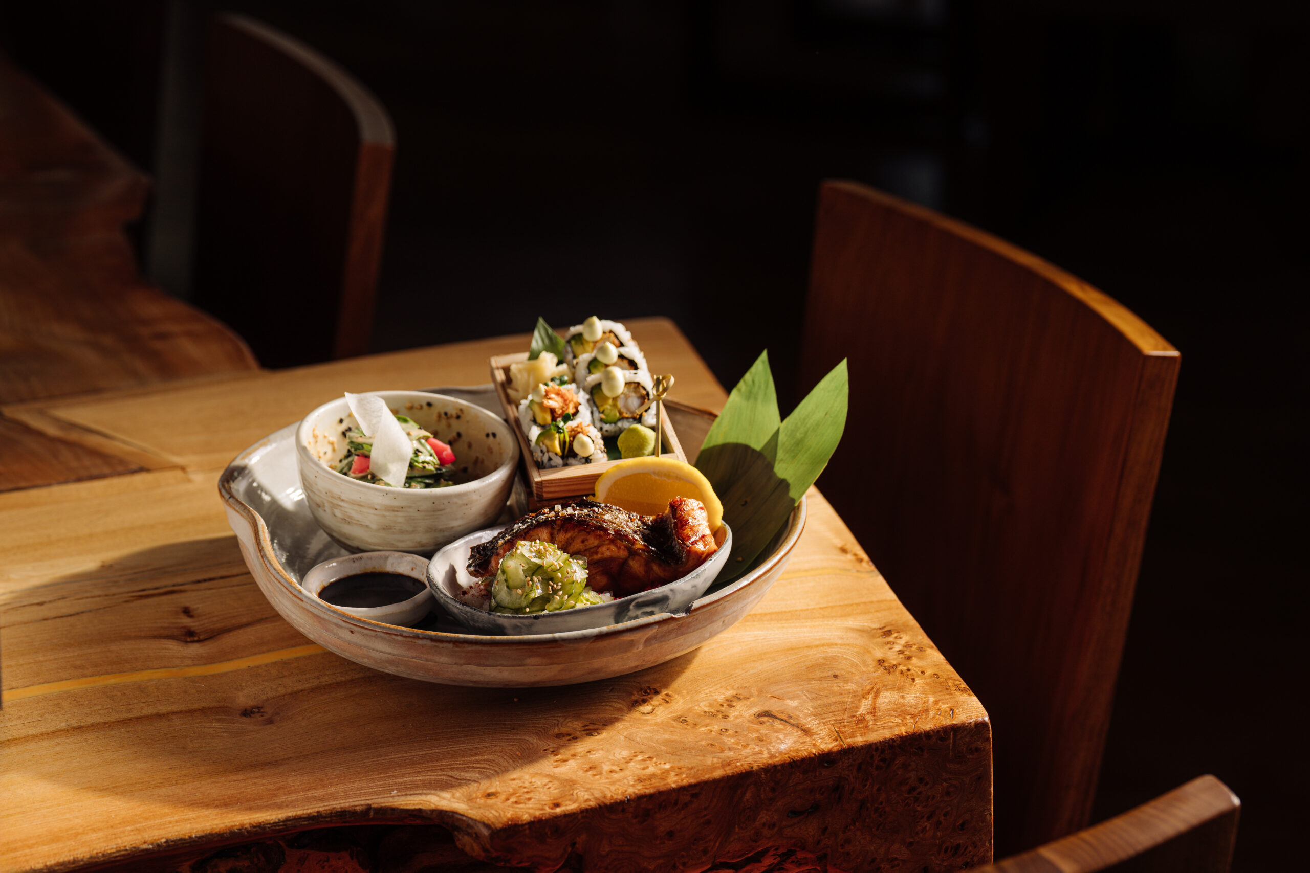 The set begins with starters such as goma fuumi no horenso salada, spinach dressed in sesame, and ebi furai to avocado maki, a crisp prawn roll with sweet soy. Guests then choose a robata main to complete their donburi rice bowl. Options include sake teriyaki with salmon fillet and sansho salt, honadori no miso yaki cedar roast baby chicken with chilli and lemon, or gyuniku to padron yaki, spicy beef skewers with padron peppers. It is structured, generous and ideal for a weekday reset that still feels polished.