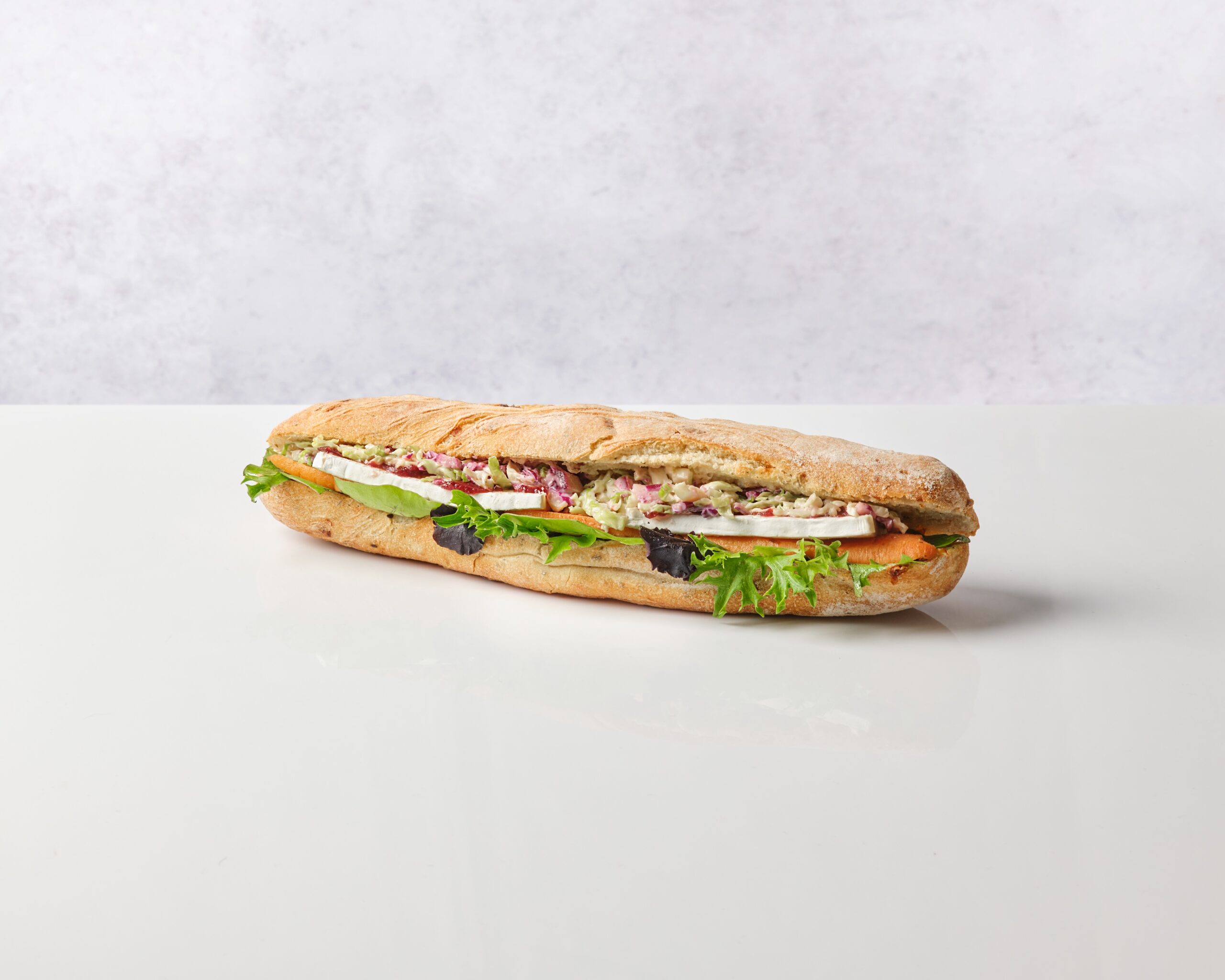 Vegetarians, rejoice. The Brie & Cranberry Baguette is a creamy, crunchy, flavour-packed masterpiece that proves festive sandwiches don’t need meat to shine. Slices of creamy French Brie are layered with vegetarian stuffing, grilled carrots, red cabbage, and Brussels sprouts, all tied together with tangy horseradish mayo and a dollop of sweet cranberry sauce. It’s rich, balanced and unapologetically festive.